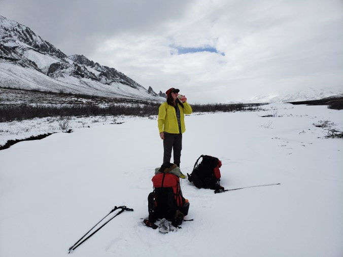 Tonight the temperature is supposed to drop to 28° again, and we can already feel it cooling as we stumble among the tussocks, looking for a flat spot to camp. At last we find one on a saddle, and pitch our tents in the snow. I dig a little hole in the snow down to the frozen tundra, and set my alcohol stove there, hoping the heat of the stove won’t melt the tundra further, making it tip. While I usually carry an alcohol stove, we’d planned on bringing canister stoves for this trip, to save a bit of hassle in an environment in which no gear must ever malfunction or break, because “town” is just not a thing. But bringing the butane canisters for the stoves on the bush planes was a huge logistical hassle of its own, with each air taxi having its own regulations, processes and fees around them, so we went with alcohol in the end. It takes many tries before my alcohol stove lights- alcohol doesn’t like the cold, it turns out- but then it does, and I set my little dinner on to cook, and gather tannin colored water from a tussock hole, and then I’m in my quilt eating hot noodles in all my layers as the wind howls in the river below, and everything is right in the world.