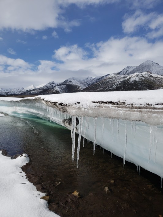 The sheet of aufeis we walked on yesterday is even more beautiful today. The icicles on its edges sparkle, now and then it rends itself in two with a boom. It’s wild to be walking out here in what feels like winter- winter in the arctic! I wasn’t expecting that at all.