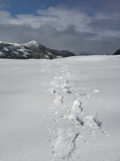 We set out. The mountains are breathtaking blanketed in white. Hiking warms us and soon I feel great- I slept last night (because I almost always sleep great in the nature, but terrible in towns?), we’re in one of the most epic wildernesses on earth, my feet are wet but not terribly painful. We walk on the gravel bars or on the tussocks, the snow falls gently around us.