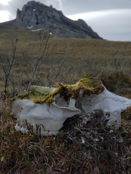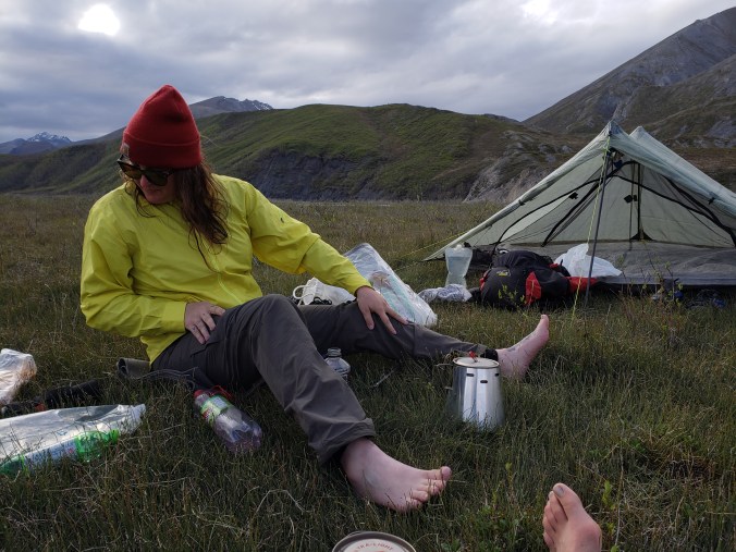 I hobble out onto the tundra to find a place to take a shit. My feet are swollen, painful stumps that yell at me with every step. I guess this is what happens when you struggle-bus your way through foot-wrenching tussocks in icy water that make your feet too numb to feel. You end up hurting them without even realizing it. Bunny’s feet hurt quite a bit too- the icy stream we’ll cross all day will help, at least.