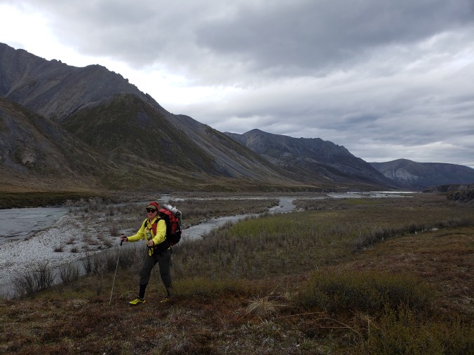 A little scramble down the other side and we’re nearly at the Kongakut, which is a real river! In that it is wide, flat and silty, and makes its way through a huge valley that gathers the light and bounces it off several formidable ridges as well as the requisite lower, browner mountains.