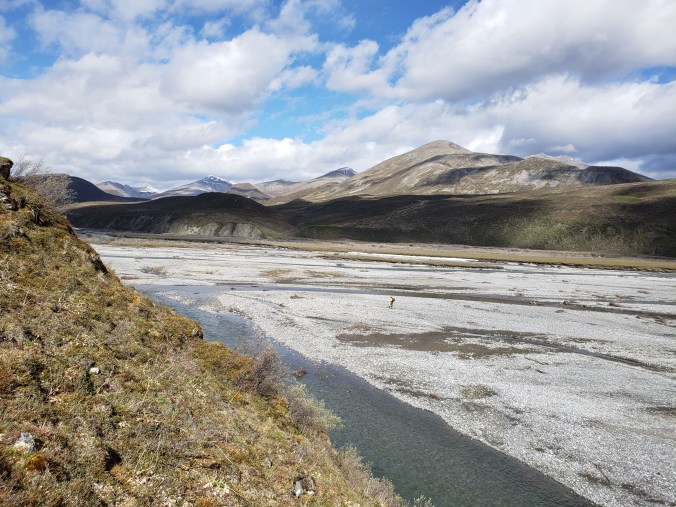 We’re wending back and forth on gravel braids of the Kongakut river in its huge river valley, today, fording various channels that are shallow enough to ford and hopping back and forth between flat banks with chest-high willows (kept at that height by the persistent monching of the caribou, who we also see on occasion, in little clusters) and the gravel with its fist-sized rocks. Just a couple of pinballs in a pinball machine, bouncing back and forth between broad banks, making our way upstream.