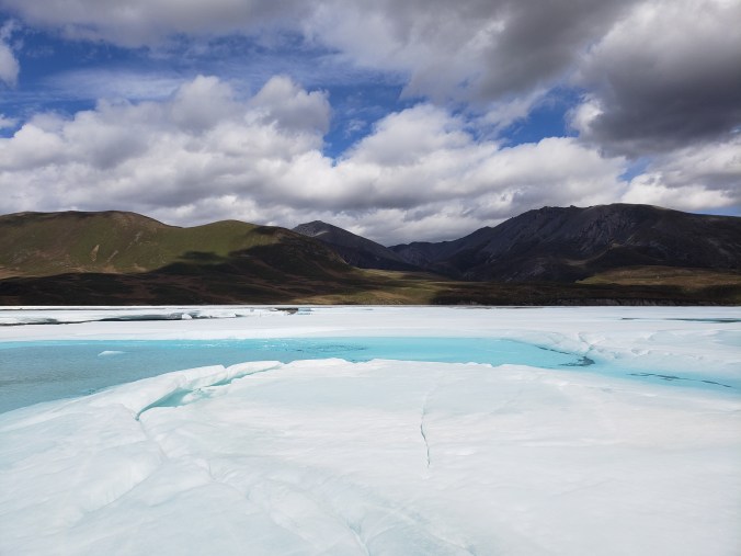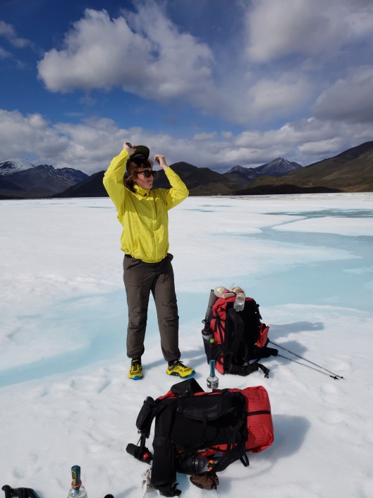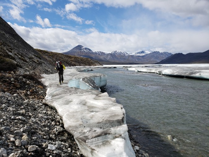 We reach more aufeis over the whole river valley, the broadest field of aufeis we’ve seen yet, and we climb up onto it and walk the six-foot thick sheet of blue glacier-lookin ice with its soft white snow top and azule puddles of snowmelt and narrow, gem-colored channels of twisting open water, trying to guess where the “cracks” might be, listening to deep booms as its edges calve into the river and asking ourselves again, is this safe? Is this safe? I suppose I could text Muffy and ask her to google it or text Kirk and ask him, but really I don’t want to know the answer. The walking is so easy up here.