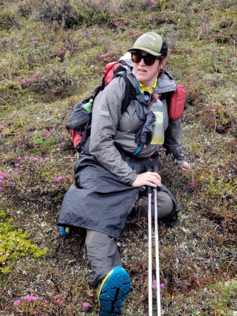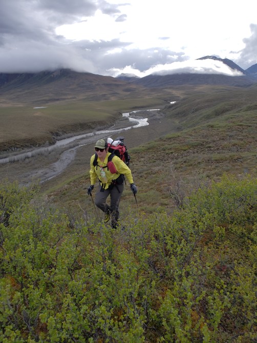 Bunny’s ankle is fucked. The pain she was in yesterday is more acute today, and I feel certain that she’s developing an injury. The first part of the day is tussocks and then a steep climb that involves a lot of side-hilling and asks much of the ankle, and she’s in so much pain afterwards that she can barely walk. We sit on the bank of the river and talk about our options. She is devastated by the possibility that she might have to get off the route. Getting off this route means scheduling an air taxi to pick you up in a little bush plane. It’s expensive and very very final. We text Kirk- he can pick Bunny up at our Sheenjek river cache, twenty miles away. We tell him that we probably want the pickup, but will text him in the morning to confirm. Then we both just sit on the river bank, feeling sad. I think about the challenges ahead of us- we still have to make it twenty miles to the cache, and with Bunny’s ankle like this? And then, I have to finish this route alone, navigating all these stream crossings by myself?