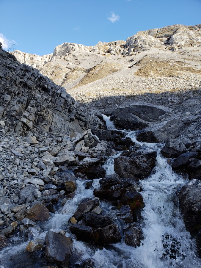 “The Brooks Range: where time is meaningless and distance is arbitrary,” says Bunny in the afternoon, when we’re taking a break in the infinite 2pm light and we realize we haven’t gone as far today as we initially thought. We follow the Kongakut up towards its headwaters and it enters a gorge- in a normal year there might be a bit of bank here, or the water would be mellow enough to walk in, but this year neither of those things is true. We walk on the steep talus along the edge of the water, occasionally walking with one foot on the talus and one foot in the murky, roiling water, and in this way we make it through. We leave the Kong for another drainage just before our pass. In all our time with the Kong, it was never anything less than raging. “These rivers need to chill,” I say.