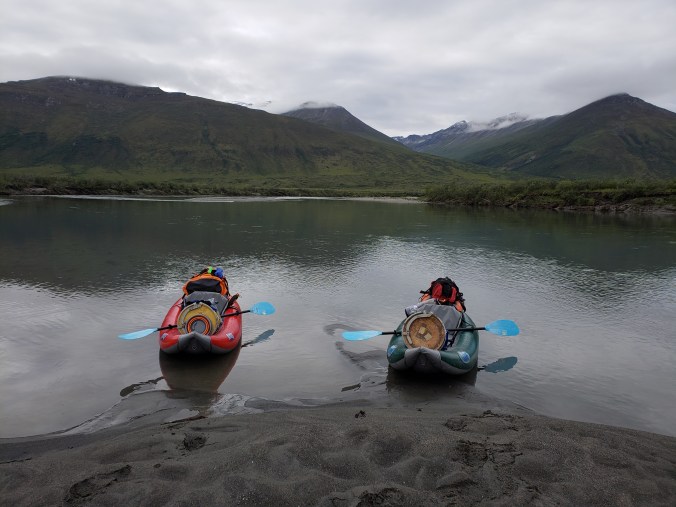 Paddling is hard. But not in a way I’ve experienced before. The Noatak today is largely flatwater, some of it nearly as still as a lake and with quicker bits under the cut banks. We are chasing these quicker bits, slowly making our way back and forth across the large winding river as the cut bank switches sides. It’s a cool overcast day, cold when the wind picks up. I paddle while the bank waves its low willows at me and the mountains slowly roll by. I’m new at this, my form isn’t very good? Bunny has experience and is faster, she keeps getting far ahead until her boat is a tiny red speck in the huge river and then she has to pull into an eddy and wait for me. What do I do if I have to pee? I keep looking at the shore, wondering what it would be like to walk there. I’d be lying if I said I didn’t miss walking. I have a feeling I’m going faster than I could walk out here, though, even if it doesn’t feel like it. And besides, I sprained my ankle two weeks ago, right after returning to Portland from the first half of our trip. I was running on perfectly flat trail around Timothy lake, and I rolled it on nothing, as I often do. But instead of the usual mild stab of pain followed by nothing, there was a loud POP and pain so bright I crumpled to the ground in tears. Adrenaline kicked in and allowed me to walk the two miles back to my van, and then my ankle swelled up to the size of a baseball. It’s still healing, so I shouldn’t be walking on it much at all. So it’s perfect that I’m in a boat. Kind of ideal, really. Still, the tundra is drier here, later in the summer, not the sopping mess we found in the eastern Brooks, and I imagine how soft and nice it would feel under my feet. Another year, another year.