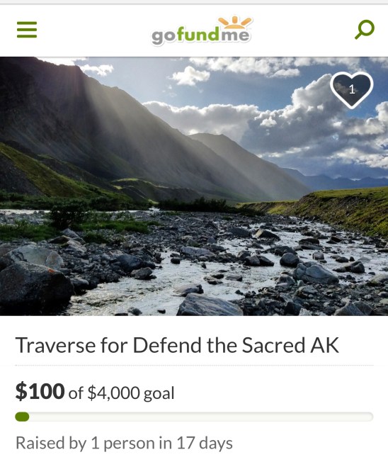 We’ve raised $7,210 for Defend the Sacred AK so far! ($6,850 on the original fundraiser, and $360 on the new fundraiser I had to create when GoFundMe bought YouCaring and the YouCaring fundraiser became defunct on July 31.) This is so awesome!! My goal is to raise $10k total for this org by the end of the summer. Day three from the Noatak will go up on this blog as soon as the new fundraiser reaches $500- you can find the fundraiser here, or click the photo below. And thanks to everyone who’s contributed so far!