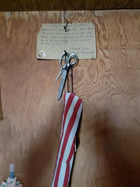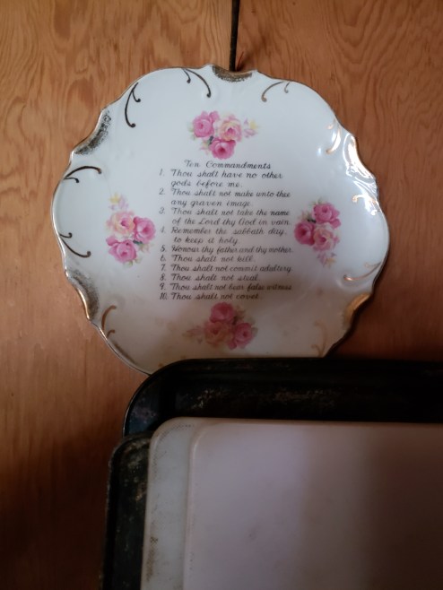Inside the binder is a photo of Howarth. He lived to be a hundred. One hundred. He had eleven children. Eleven! On the wall is a brittle note in his handwriting, plus a decorative plate with the ten commandments.