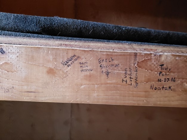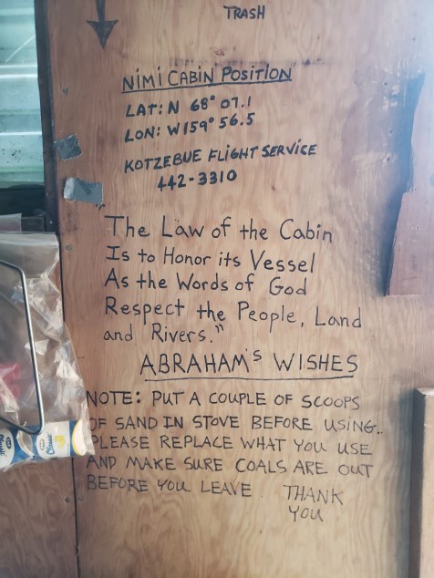A curling map of the area is tacked below that. People have carved their names into the bunks. This cabin is both the present and the past, in a way that’s so beautiful it aches. Suddenly I’m overwhelmed, and I can’t really say why. This cabin in the vast arctic wilderness, unlocked and open to strangers and built by an Inupiat man who had eleven children, was a whaler and lived to be a hundred, feels like something too real and too vulnerable to exist in the modern world. Like it shouldn’t be here. Like I’m lucky to have seen it. Like it will be gone tomorrow. Nothing and no one is really this free, anymore. Are they? I want to cry. I want to stay in the cabin all day, inspecting each object, reading the stacks of notes in the log book that date back decades and carefully photographing each one. The notes on yellowed pages, written in tidy, careful script. Notes by travelers who stayed here before satellite phones. Who were hiding out from blizzards, getting caught in headwinds on the river, running low on food. Hunting wolverines and caribou. Fishing. All the stories this cabin must have seen. I feel another wave of emotion. Nature… but with people in it. A little cabin built of tin. Someone living here. Living on the river. With the river. As if you can just DO that.