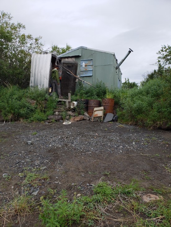 A few miles into our day we round a bend and see our Swiss friends’ inflatable canoe pulled up onto shore in front of a small tilted cabin made of corrugated metal. Curious, we pull ashore too. The cabin has no windows, and a large sheet of plywood gets nailed over the front door to keep out the bears. Manuel and Lucas come out of the shadowed doorway, carrying their drybags. They stayed in the cabin last night.
