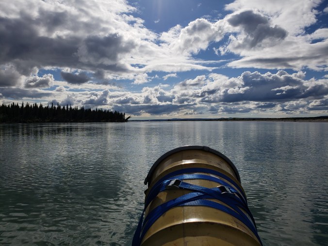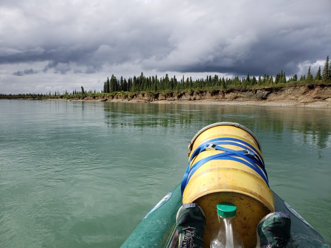A storm arrives midday and the whole world turns to water; the air is water, the sky is water, the ground below us is water. I rotate in my little boat in the storm, paddling furiously to avoid the flood-flung spruce trees that have become sweepers along the bank and then dropping my paddle again as water rises up from below and comes down from the sky, feeling awed and a little overwhelmed. We’ve reached the part of the map where the river looks like a french braid that’s come undone in the wind and we can only hope we’ve chosen right at each split- that our channel won’t peter out, turn to shallow gravel or a lake. In the afternoon we begin to see buildings in the distance, up on a bluff above the river- Noatak village! Good god, humans exist! I figure on my map how many miles until the village- seems like we’ll reach it once we’ve gone 39 miles, which at our pace will take until about 6:30 p.m. Except at 6:30 we’re on a massive channel- what seems to be the main channel- and there’s just spruce forest on either side, no village to be seen. I look on Gaia and dang! We’re actually in the wrong channel- Noatak village is a half mile and one huge channel to the north. If we’d picked the right channel the river would’ve taken us right to it but instead, we’re here.