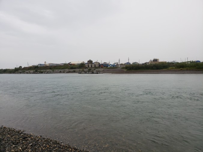 So we leave our boats on the beach and walk, propelled by our longing for town food, other humans, and whatever other luxuries Noatak might offer. We find a sandy wash that cuts across the island, marked with the tracks of bears, wolves, birds and creatures we can’t identify, and soon we’re standing on the other side of the island, facing a deep channel across from which is a steep bank and on top of that, the small houses of the village.