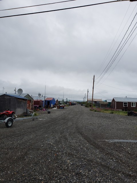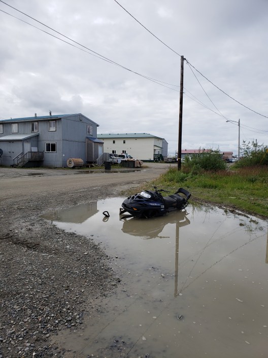 “The store’s that way,” says an Inupiat man on a 4-wheeler, smiling. Everyone here is Inupiat. It’s an Inupiat village- when white people appear, they know exactly who they are (paddlers) and what they want (the store). We’ve been wandering around for a few minutes amongst the small, colorful houses, not sure where to go and I thank him, grateful. It’s still raining and the village is quiet except for the thrum of the large generator on the edge of the bluff and the barks of massive, furry dogs, tied up in the yards. The store, a supermarket really, is housed in a huge grey building. Inside it’s wonderfully warm and bright, and aisles are packed with everything you could possibly want, or need to buy. The prices are alarming- $3 for an apple, $9 for a gallon of water- but I understand (everything is flown in on tiny planes from very, very far away) and I don’t care (I’m so hungry today, somehow). I think about the people who live here, though, as I put a banana, a bottle of water, a bag of doritos and a can of tamales in my basket. How do they afford to eat? I know that the Inupiat people do a lot of subsistence hunting and fishing, still- they have whales, salmon, seal, caribou, moose, berries and other things- but they also, justifiably, want to eat the same shit that everyone else in the western world gets to eat- ramen, soda, apples, frozen chicken nuggets. How do they afford it, though, in this village? It hurts my brain to think about.