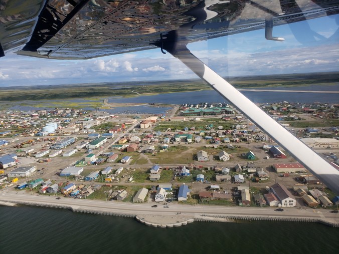 At five p.m. we’re on a tiny plane above Noatak village, our boats deflated and stowed in back, our bear cans mailed away at the village post office. I watch as we follow the Noatak river as it meanders towards the sea, amazed at being able to see it from this perspective. I felt like I wasn’t able to take great photos on this trip- partly because I needed my hands to paddle and partly because the perspective in my boat was always the same- the lowest point. There weren’t dramatic mountains, and sunset was a strange affair that always happened when I was asleep and bled immediately back into day. But now I can see everything- the distant mountains, the shadows of clouds racing across the land, and the river in its full form- oh my god, the river- my heart aches with fondness for this river. The tundra turns to wetland with hundreds of tiny lakes that shine like coins as we near the ocean and then, suddenly, below us is the sea- milky green, brighter than the sun, breaking with waves and studded with fishing boats that look like children’s toys from this height. The Chukchi sea! And just south of us is the Bering strait! And over there, out of sight, is Siberia! I am flooded with feelings. I want to reinflate my boat, get back in, and paddle across the open ocean to Russia. How can a place that seems so far really be this close?
