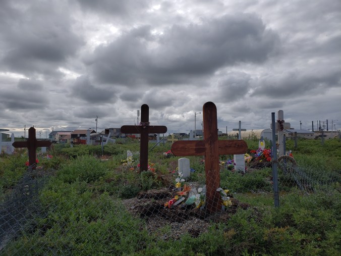 Bunny joins me with a bottle of mountain dew and a package of mini donuts and we eat, watching the rain. Every single person who walks by smiles at us hugely, and welcomes us to Noatak. I honestly didn’t expect people to be this friendly- I would’ve understood if they weren’t. This village isn’t set up for visitors- there isn’t a restaurant or an inn or anything really, except for the store. But people are really, really nice.