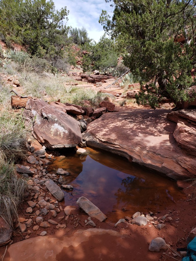 We’ve dropped down in elevation along the rim of Woods canyon and it’s hot today. My feet are hot. The trail is hot. Dust. We’d been gunning for a “silty, almost undrinkable” cattle pond for lunch, stoked that we brought sawyer squeezes, alongside our steripens, for just such an occasion. (We brought both because squeezing all our water is a pain in the ass. But if we just had the steripens we couldn’t do the silty cattle ponds, and would have many potential 20-30 mile water carries. So far, having both has been a dream.) But then we saw that just past the cattle pond we drop down into the drainage for Dry Beaver Creek, which “may have pools of water in wet spring years”. This is one of those years. So now we’re descending into the drainage on the rocky tread, fingers crossed for tinajas.