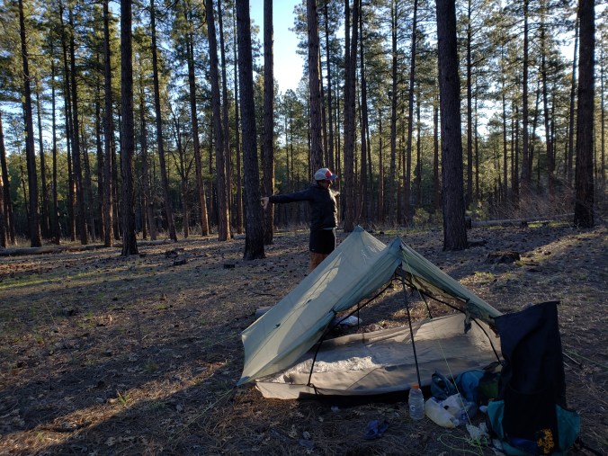 The ponderosa forest is perfectly still and cold, the stars bright, the moon so full it feels warm, there isn’t one drop of condensation. We’re warm and cozy, I’ve never felt anything as comfortable as my neo air. We wake at dawn to turkeys gobbling in the distance. My socks have somehow dried in the night. Everything is perfect.