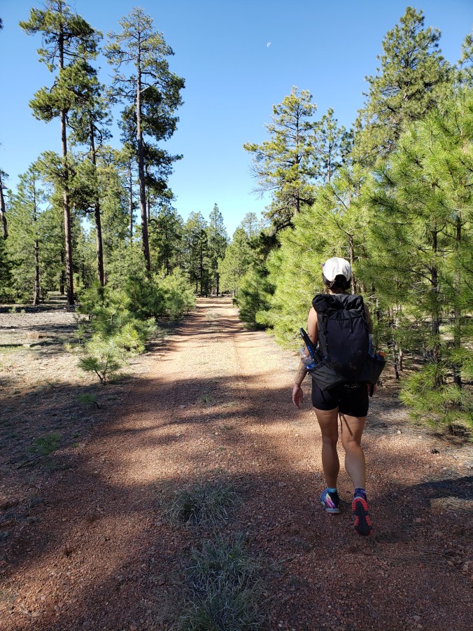 We want to hike the miles we missed when we hitched into Forest Lakes Estates to catch the store before it closed, but how? Should we hitch back to the trailhead where we bailed? That seems hard to conceptualize, for some reason, while I drink my drip coffee in our cozy RV park cabin as the sun comes up. Walking there from here, though, headed west, and hitching back to this cabin when we finish- that seems easier for some reason. We pack water, bars and a layer. We should be back in time for checkout, so we can leave our things. Time to slackpack!