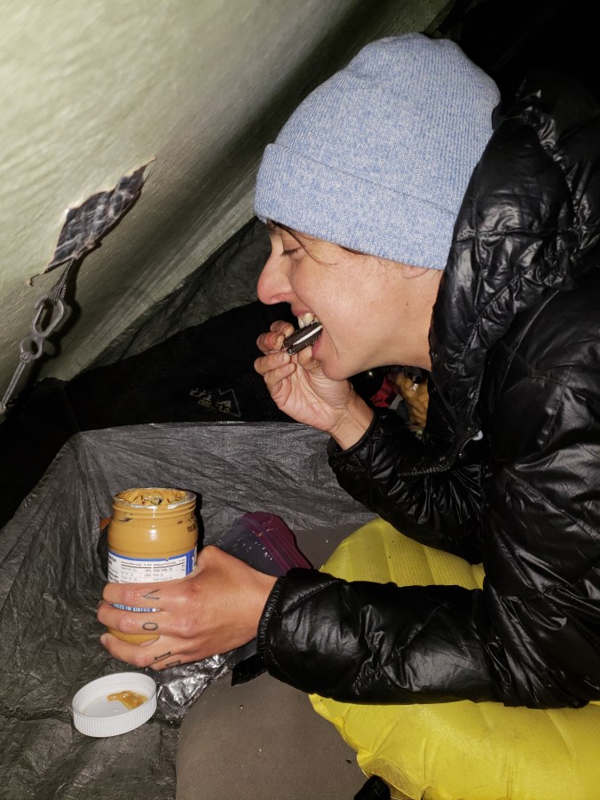 “I’m so scared,” says Muffy. “And hungry.” She rustles in her food bag, startes eating oreos dipped in peanut butter in the dark. She puts the peanut butter away, curls up on her neo air, and one minute later she’s asleep. I scoot down in my sleeping bag, which is damp already from condensation coming in from the lake, and try to sleep too. It works.