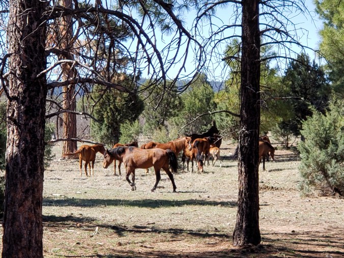 Water today is two wildlife guzzlers- water catchments that fill large underground containers, with a part that’s open to the air for animals to drink. The first one is surrounded in wild horses that thunder away when we approach- they were monching a pile of rocks next to the water, maybe for minerals? The guzzlers have horse hair in them and algae, but are mostly clear as long as you put your bottles all the way under and don’t catch anything that’s on the surface. We also find a few running streams on our cross country alternates, bonus water in this magic wet spring.