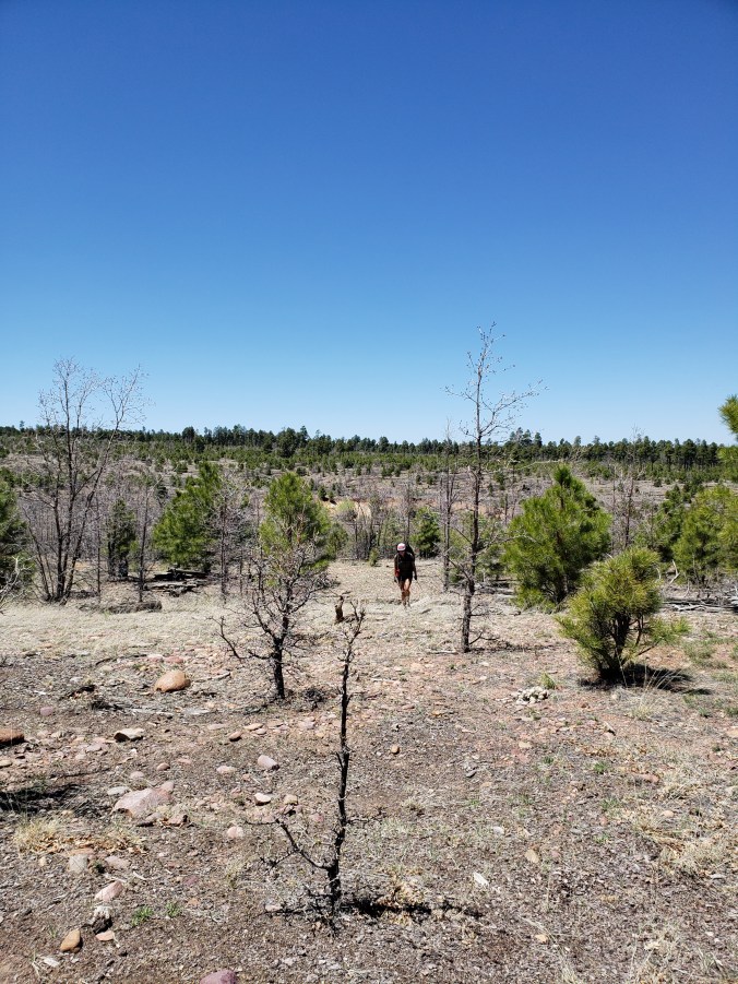 Today is gentle forest service roads and faded jeep tracks through the ponderosa forest, both burned and intact. Just that, all day long. A dream really. We mix it up by creating some cross country alternate shortcuts, hiking off route over saddles and valleys, weaving through stands of baby ponderosas and stepping over downed logs, following horse trails, feeling wild and free.