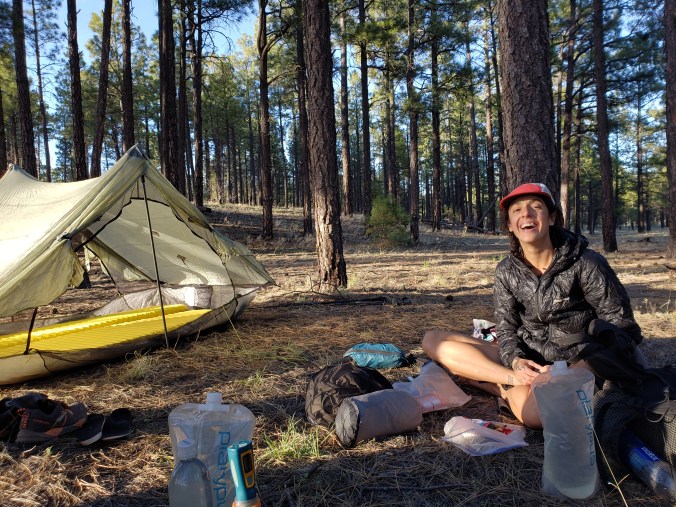 Camp is in the tall ponderosas near another catchment tank, this one aboveground, the size of a small cabin and with a spigot on the side. We’re so hungry we eat all our dinners and oreos and chocolate too. In the distance we hear gunshots, the sound of ATVs. But we’re safe here, away from it all, in this space where our two legs can take us.