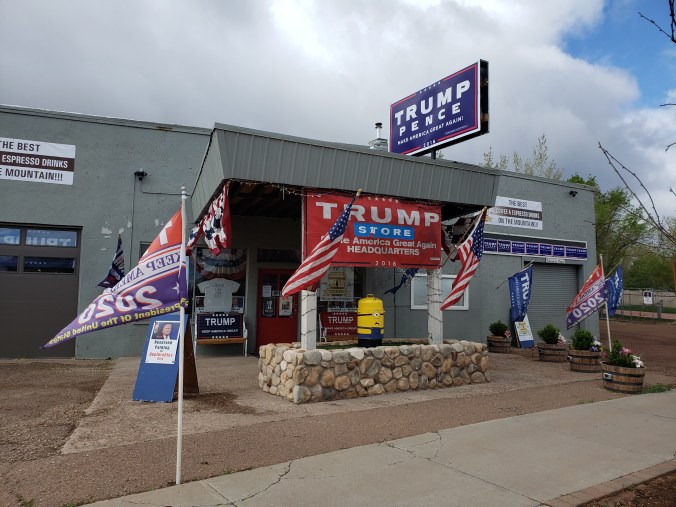 Show Low is a an exaggerated rural American cliche. Trump stickers everywhere, American flags, camo, massive pickup trucks. That anyone could support Trump is insane, but of course many Americans do, because of the capitalist white supremacist values on which this nation is founded. Trump is America, distilled to its purest essence. We made him, like a monster created in a laboratory in a science fiction story, and now we don’t know how to go back in time and stop the chain of events that set this all in motion. The reason the people of Show Low in particular support Trump makes sense to me in a way it never did before. Show Low, founded in 1870. When the genocide of the Native Peoples of Arizona was in full swing. The people of Show Low today, the ones in the Safeway and at the Hardware store where we resupply, the donut shop where I eat donuts, the cafe where Muffy orders a black bean burger- these are the descendants of the white people who came across the Mogollon Rim in wooden wagons just 148 years ago. The white people who used manifest destiny, a belief in the superiority of their race, as a moral shield as they broke treaty agreements and stole land, as they organized into parties of vigilantes and pledged as volunteer soldiers, gathered their abundant firearms and ammunition, and crept upon Apache camps in the night, and slaughtered everyone they could.
