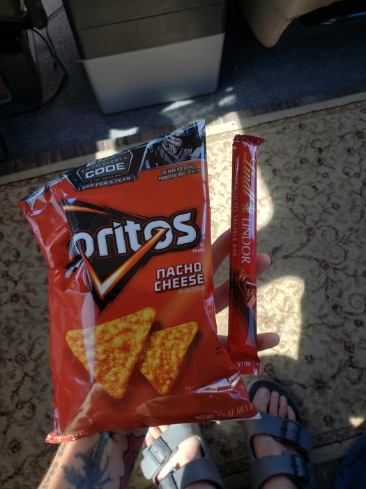 I stop at a gas station and buy lunch- a giant fountain cup of iced tea, a bag of nacho cheese doritos, and a chocolate bar. The insane calorie needs I’ve experienced while long distance hiking, combined with the relief that came from being able to eat whatever I wanted after healing from chronic illness a few years ago has given me a shameless, non ironic love of junk food that will likely last for the rest of my life. The fridge in my van is full of healthy food but instead I sit on the bed and eat my doritos. I’m just here to like, enjoy the sensual pleasures of embodiment, man.