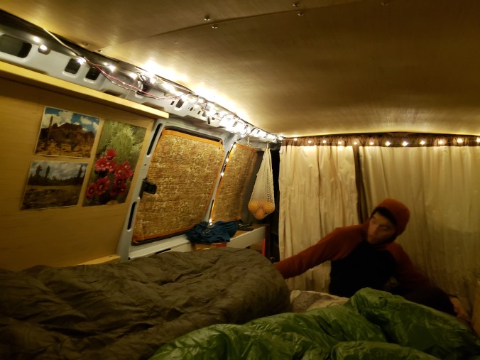 The night, when I step out of the van, is icy and sharp. I shiver as I brush my teeth and spit into the dirt. Laurie and Plants are poking around in the brush, looking for places to camp. I flick on the lights on my van, creating a cozy insulated house. Of course we’ll all sleep in here. It only makes sense.
