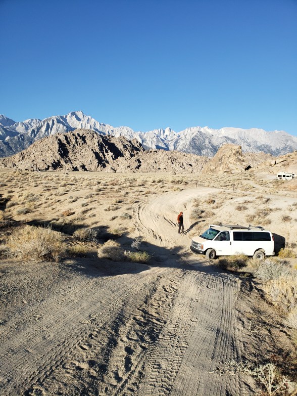 There’s an RV in seemingly every dark, sandy pullout in the Alabama hills, and we drive further and further into the rocks, the road becoming sandier as we go. Then, we dip down into a wash and my van can’t get up the other side. The sand is too deep! We roll back and forth, wheels spinning.