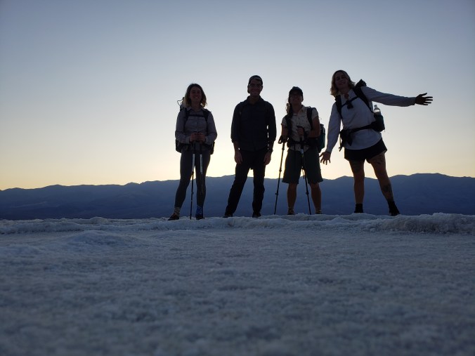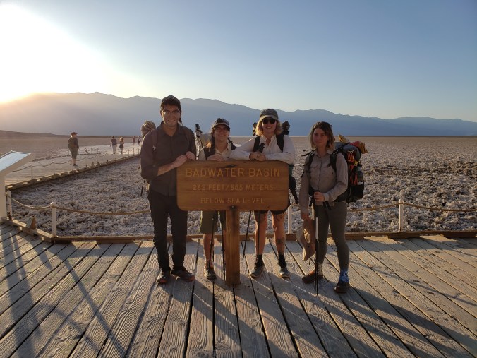 Their names are QB and Endless, and they got off the Hayduke, hitched to Vegas and rented a car in order to attend a wedding. They’re on a short trip through Death Valley, en route. After the wedding, they’ll hitch back to the Hayduke. They offer to drive us to Badwater basin. I cannot believe our luck! Not only do we not have to hitch, but we’re getting a ride from Hayduke hikers? This is amazing. We pile inside their massive pickup truck, crank the air conditioning, and we’re off.