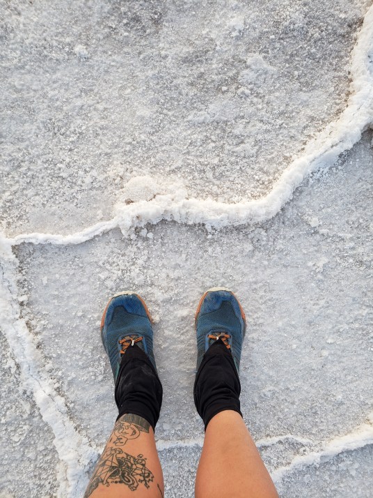 Tonight is the full moon in Aries. I know very little about astrology, but that sounds nice. Full moon in Aries. This bloated moon spills over the crest of the pink mountains behind us, casting long moonshadows just as the last of the daylight fades in the west. We don’t need headlamps. The night is dark and also bright. Cronch, cronch, cronch go our footsteps as they break through the crusts of salt. The cronching echoes in the thick air, which swallows all other sound.