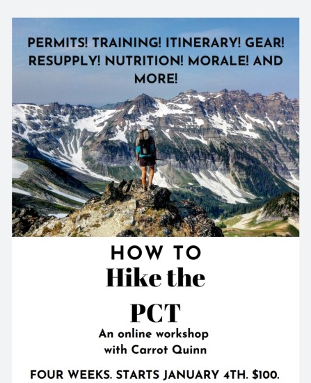 Just a few more weeks to sign up for my 4 week course on thru-hiking the PCT, which starts January 4th, 2020! Click here for more details, and to reserve your spot!