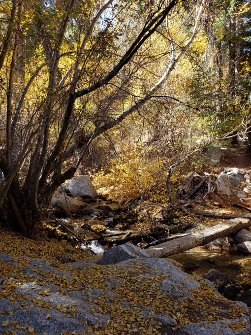 There’s a trail at Lone Pine campground that will take us the rest of the way to Whitney portal, no need to walk the entire road. We enter a forest of flame yellow aspen trees and massive sequoias, cool air, and clear creeks. It’s one of the most beautiful places we’ve been on this route and I wish I could stay here, that this was just the beginning of our hike, not the end.