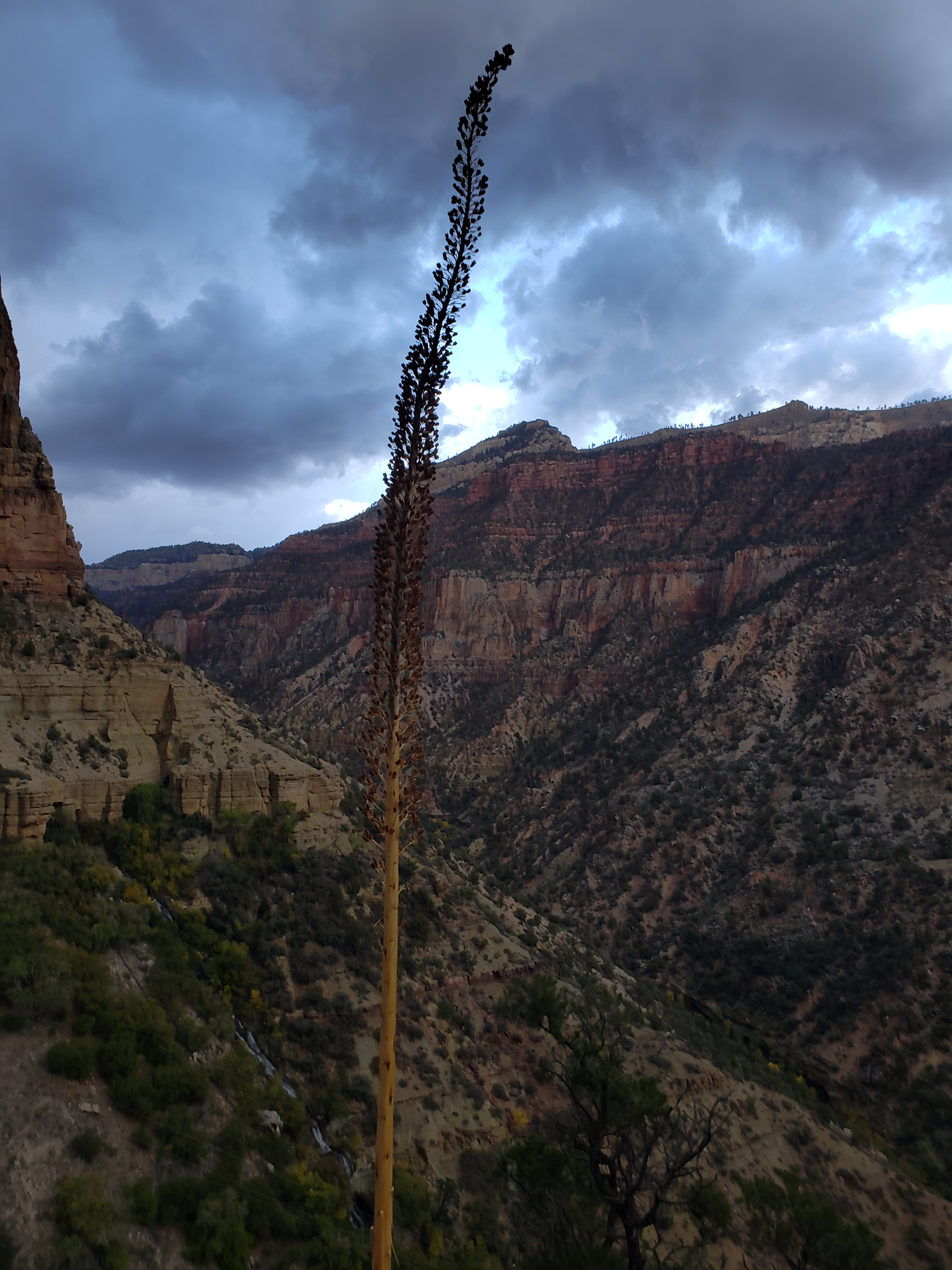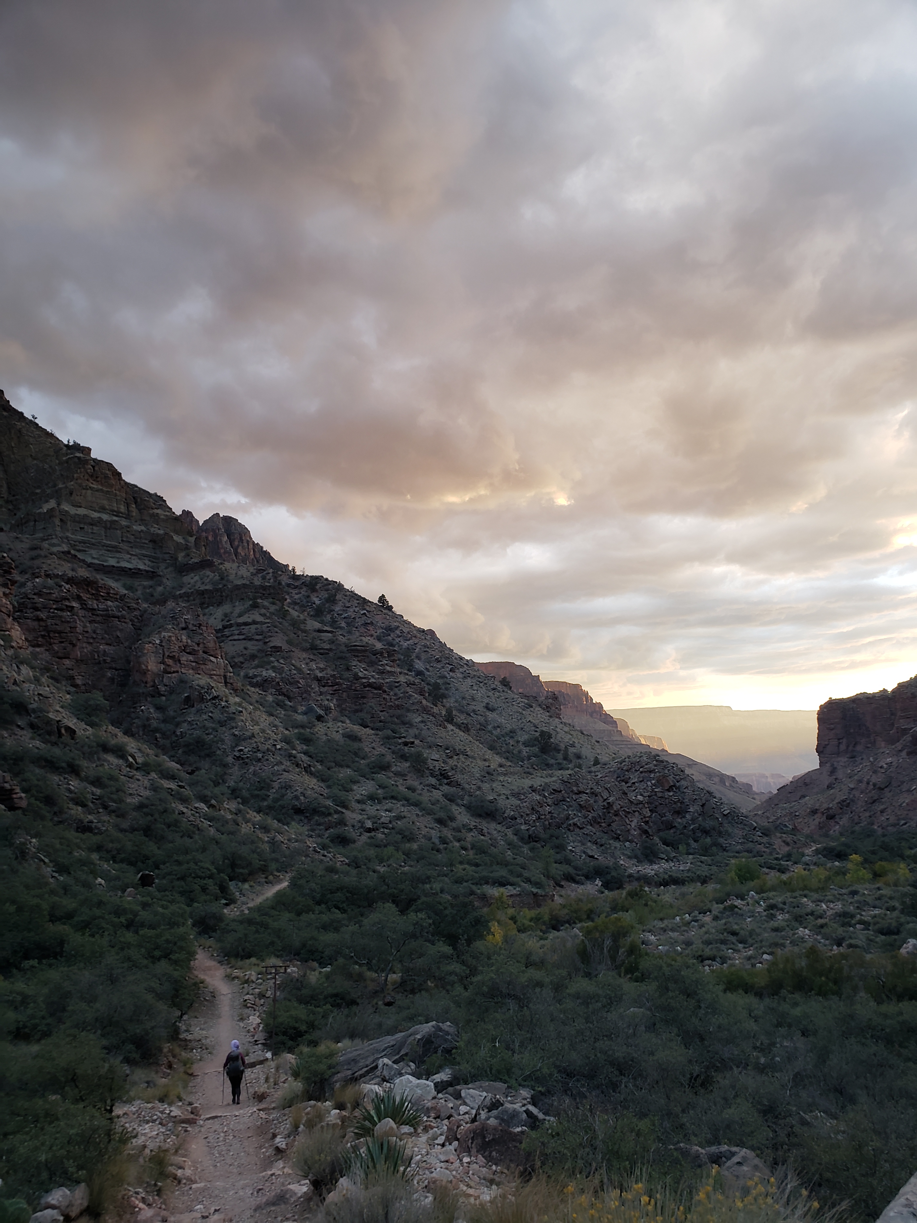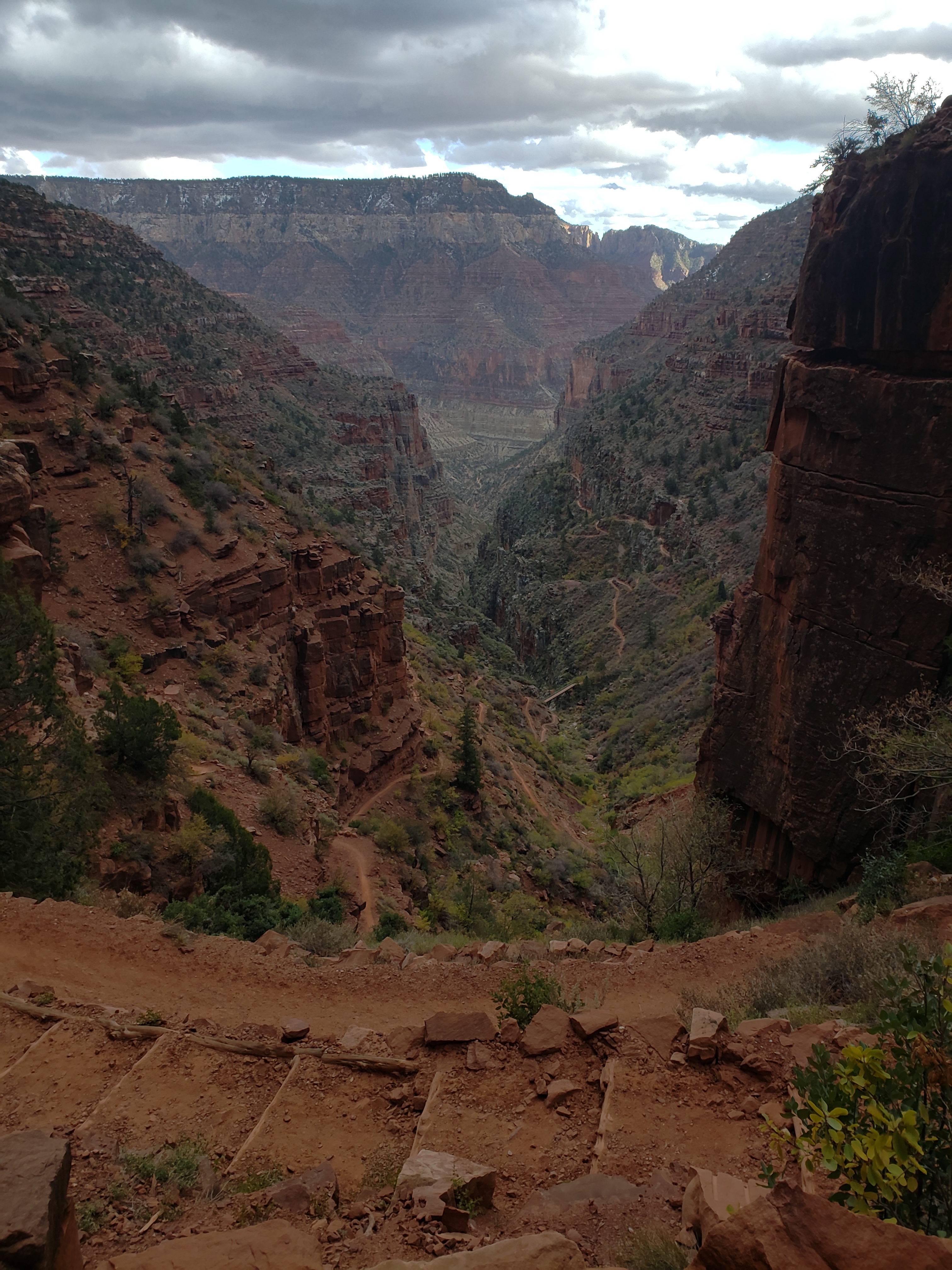 We reach the ranger station at the North Rim in the afternoon, where they will decide our fate- a permit to camp in the warm cleft in the earth, or will we spend another night on this cold ass rim, with a storm blowin in? Incredibly, they give us a permit to camp at the stock camp at cottonwood canyon. As soon as we drop in it is warmer. This is glorious! And this fucking canyon! I always forget. It is amazing. Its own planet. Its own solar system. Worlds folded into worlds, endlessly. A gluttony of intricacy. I understand why people spend their entire lives obsessed with this place. It makes me want to cry, so I do. Now the light is doing something wild with the clouds. Good god.