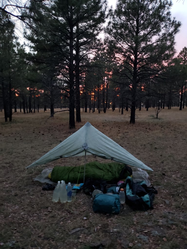 By 8 a.m. we’re back on trail, which consists today of flat jeep roads through soft warm ponderosa forest. We run into two AZT bikepackers, who have one thing to say about carrying their bikes across the Grand Canyon: “It sucked.” Today they’re zipping along, tho, and I envy them. I know when the trail gets rocky I won’t.