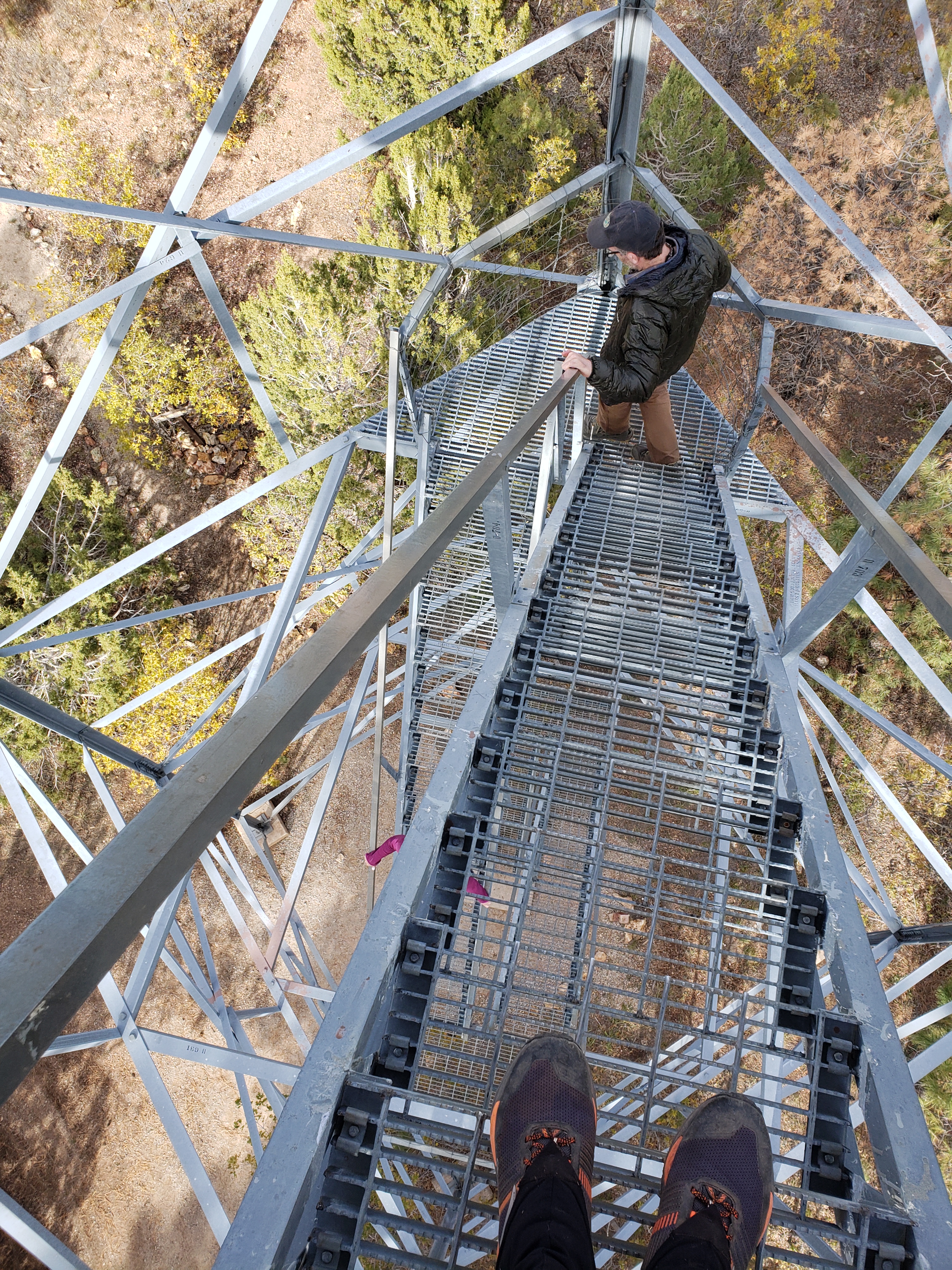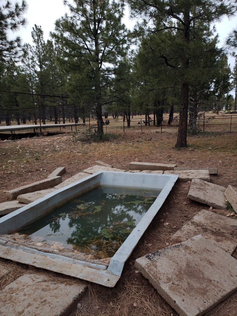 We reach a fire tower lookout in the afternoon and climb the steps- in the distance we can see the mountains around Flagstaff. An interpretive sign tells us we’re on the Coconino Rim now. There are some oak trees mixed with the ponderosas here, and it’s not as cold as the north rim was, so that’s nice. Camp is near a wildlife guzzler of greenish but pleasant water, and the sunset glows fire in the trees, and the yellow moon rises.