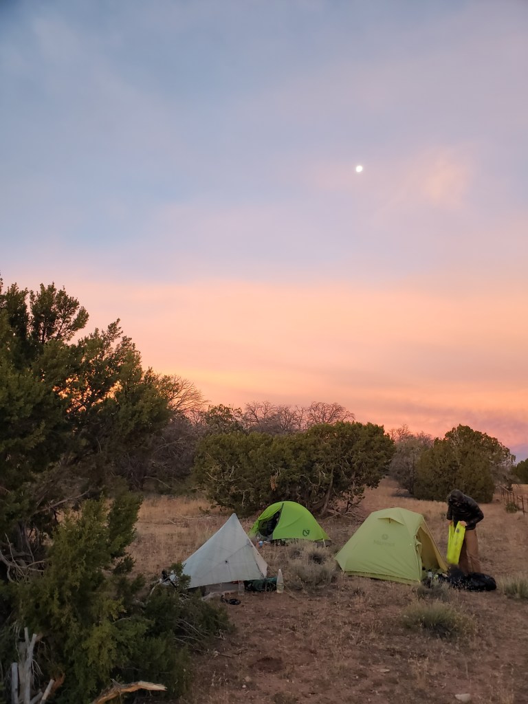 They text their partner, CJ, who is down to meet them on trail tomorrow and pick them up. As the three of us walk, we brainstorm ways to have a going away party at camp. Olive oil drinking contest? Eat spicy things? Make a piñata out of a platypus bladder full of sticks? We walk through a beautiful sunset, and in the end we settle for eating dinner together in the dark.