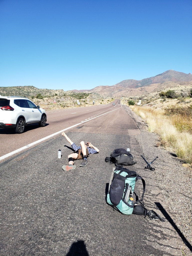 Tinajas in the bubblegum colored rock. Plump agave, sharper than a razor. Climbing up onto the ridge and the sun suddenly, brighter than anything. Languid warmth creeping its way into my bones. Then I’m sweating. My face is roasting. The drawback of hiking a trail southbound- walking into the sun all day. Lava rocks on the trail. We exit the Mazatzal wilderness- now there’s a gate, yellow grass, signs of cows again. The trail is an eroded dirt road. Sweat drips into my eyes. By midday Matthew and I are standing on hwy 87, thumbs out, melting into the blacktop. It’s a 30 something mile drive to Payson, where we’ll resupply.