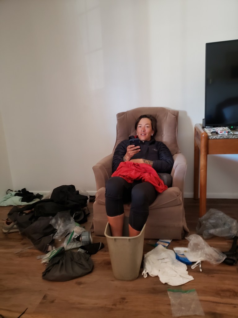 Checkout always comes too soon and we drag ourselves away from the nice comfortable room, out into the warm, too-bright world. At the post office I pick up the new cascadias I ordered online! Which feel like walking on clouds. Matthew sits outside dutch bros drinking an oat milk latte and cruising for rancher daddies in cowboy hats and wranglers. Laura purchases muffins (which she smashes), hard boiled eggs and peanut butter cups for the short stretch to her next resupply. At two p.m. Alan, a local man who provides a sort of taxi service and gives lots of hikers rides, picks us up and shuttles us south. At a junction we say goodbye to Laura, who is hitching the rest of the way to Roosevelt lake, where she’ll get back on trail. She’s gonna go full speed ahead now to the end, and we likely won’t see her again. It’s sad! Laura is wacky and hilarious and a beast of a hiker yet somehow very modest and genuine, a true canadian gem. We’re gonna miss her! But we’ve talked about tentative future hikes, so there’s that potential to look forward to.