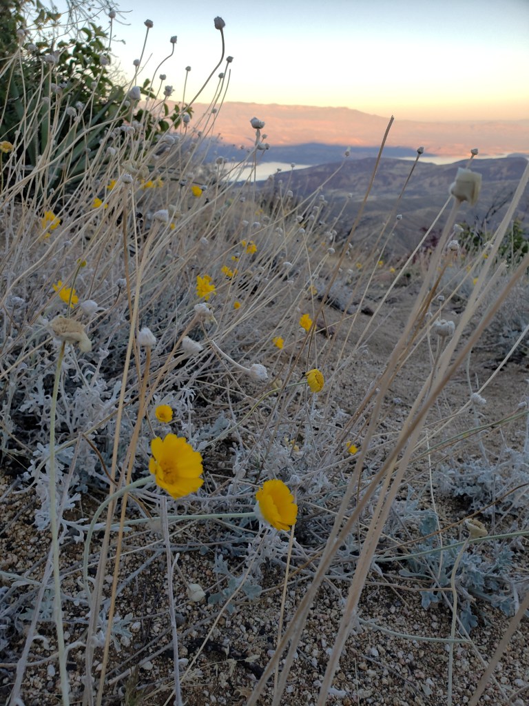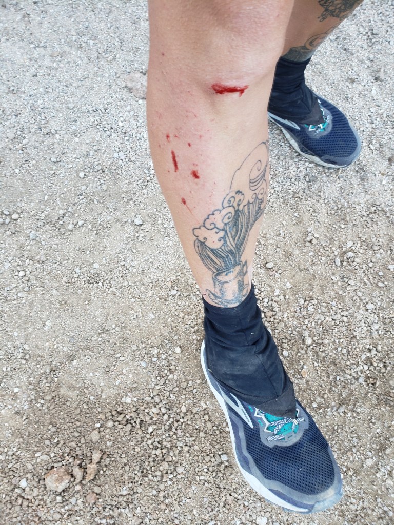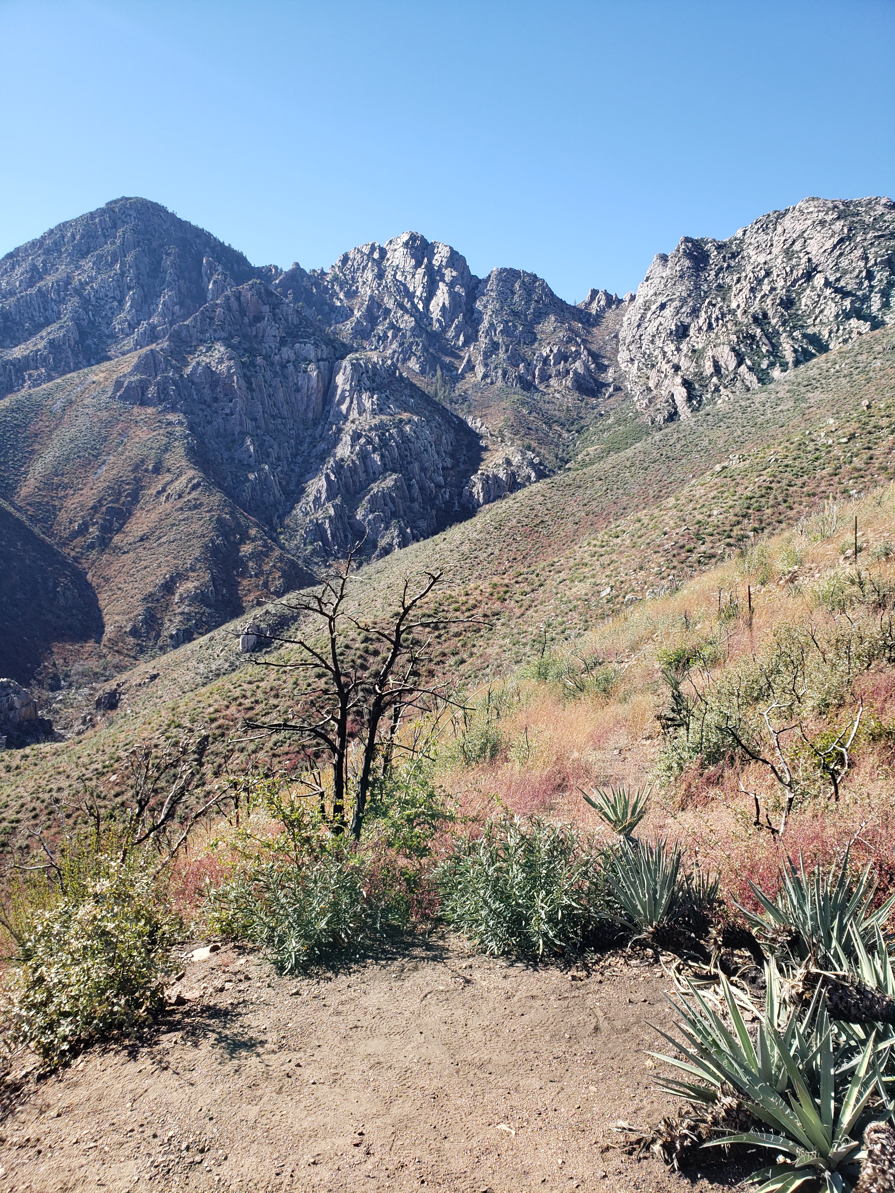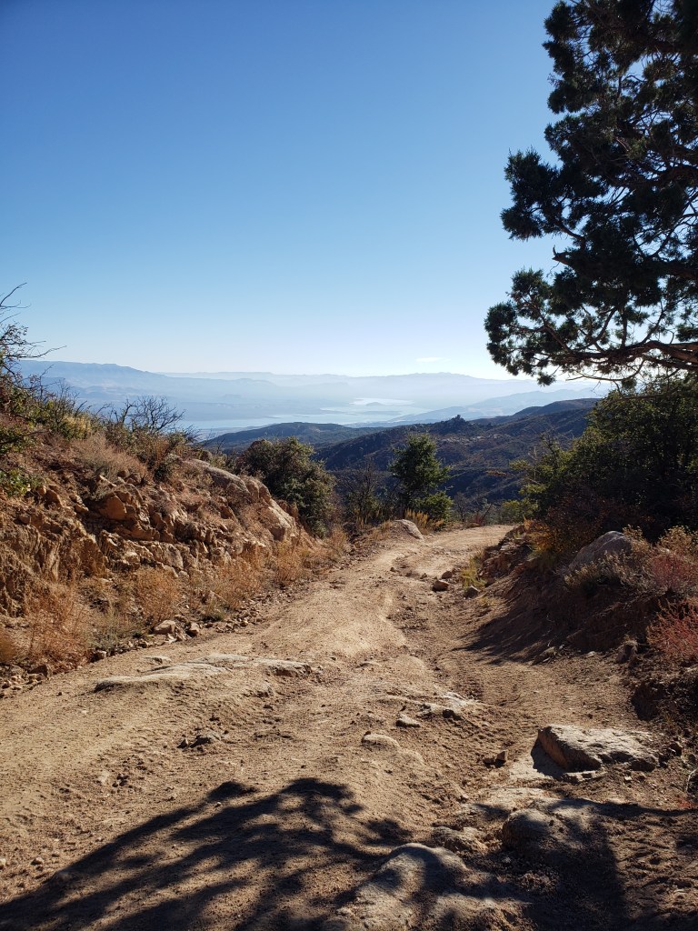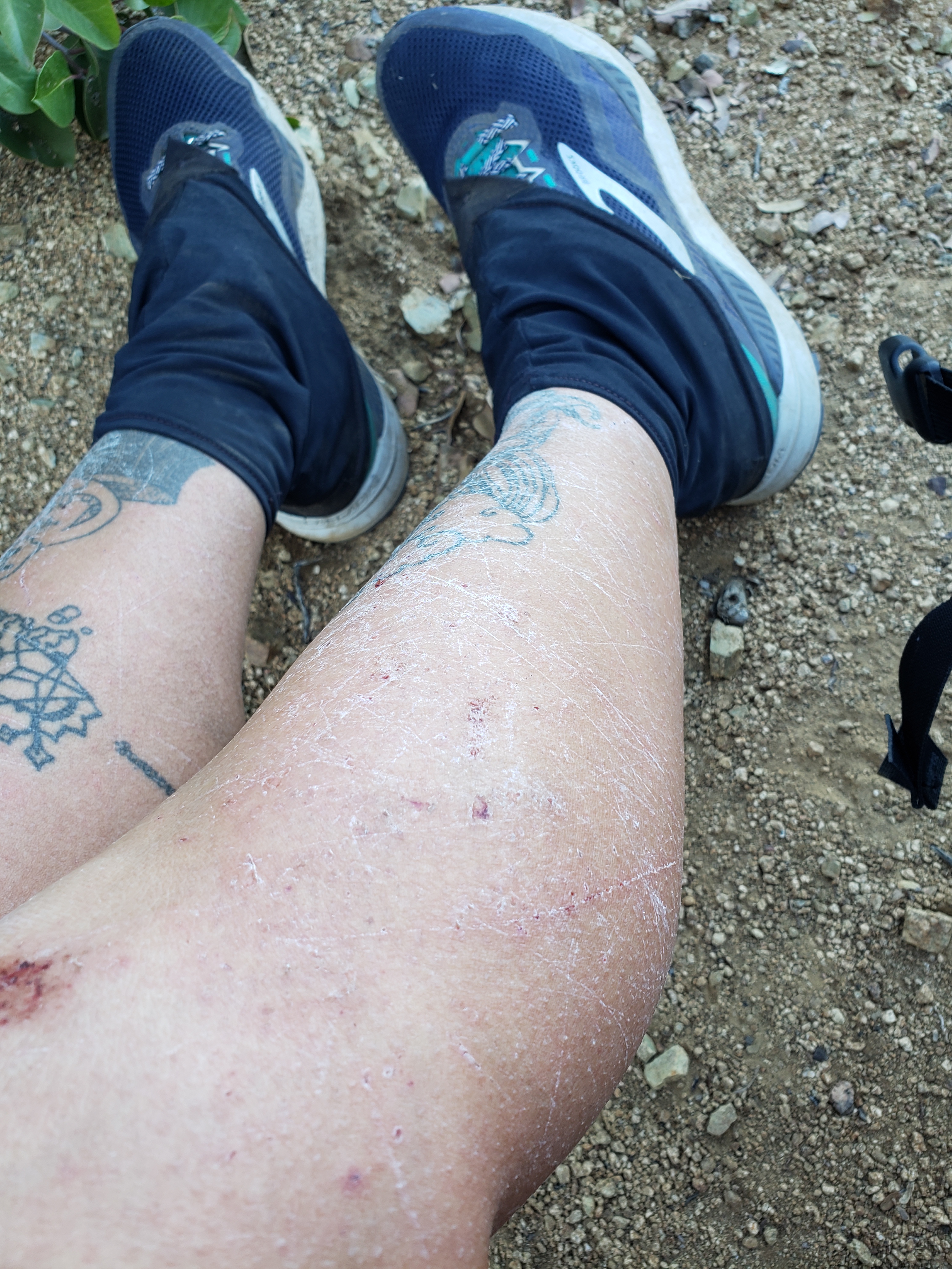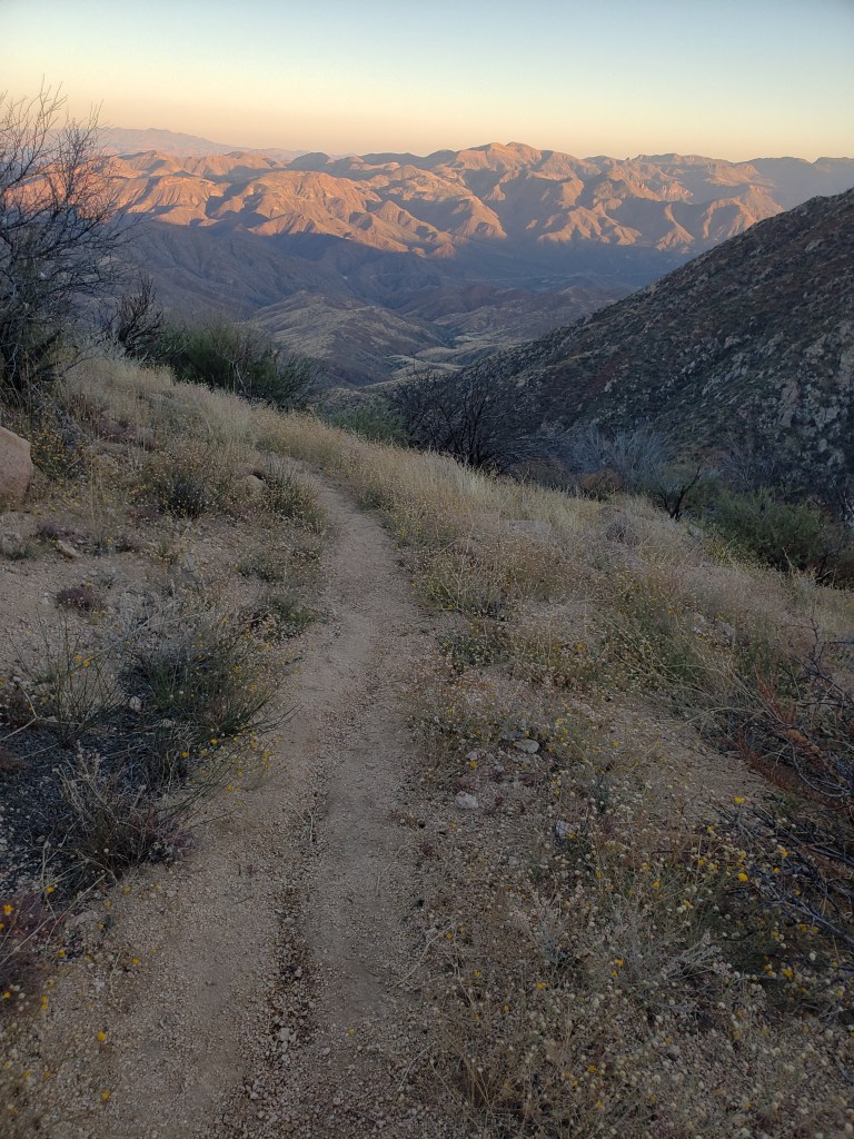 We’ve got about four thousand feet of elevation gain today, in the heat. This heat! I’m still getting used to this heat, our new normal for the rest of the trail. Raw dogging the entire arc of the sun each day, letting it roast all my exposed skin. And since we’re southbounding it’s right in our faces for a lot of the day too. I plod uphill, my clothes and the back of my pack soaked in sweat. I am covered in salt. We’re following a washed out, eroded jeep road. Below us we can see the hot valley around Phoenix, a gentle haze wrapped around each rocky peak. I eat shit on the road, twisting my ankle and giving myself some road rash on my leg. We leave the jeep road for a trail littered with loose rocks. Cat claw swipes at our shins. We dodge stabby agave. The rocks continue to wrench my ankles over and over. And the insoles in my shoes are rubbing blisters into my toes- I got these cascadias on ebay, and they came with the wrong insoles- they’re too small, and float around inside the shoes. There’s kind of a lot going on for me today.