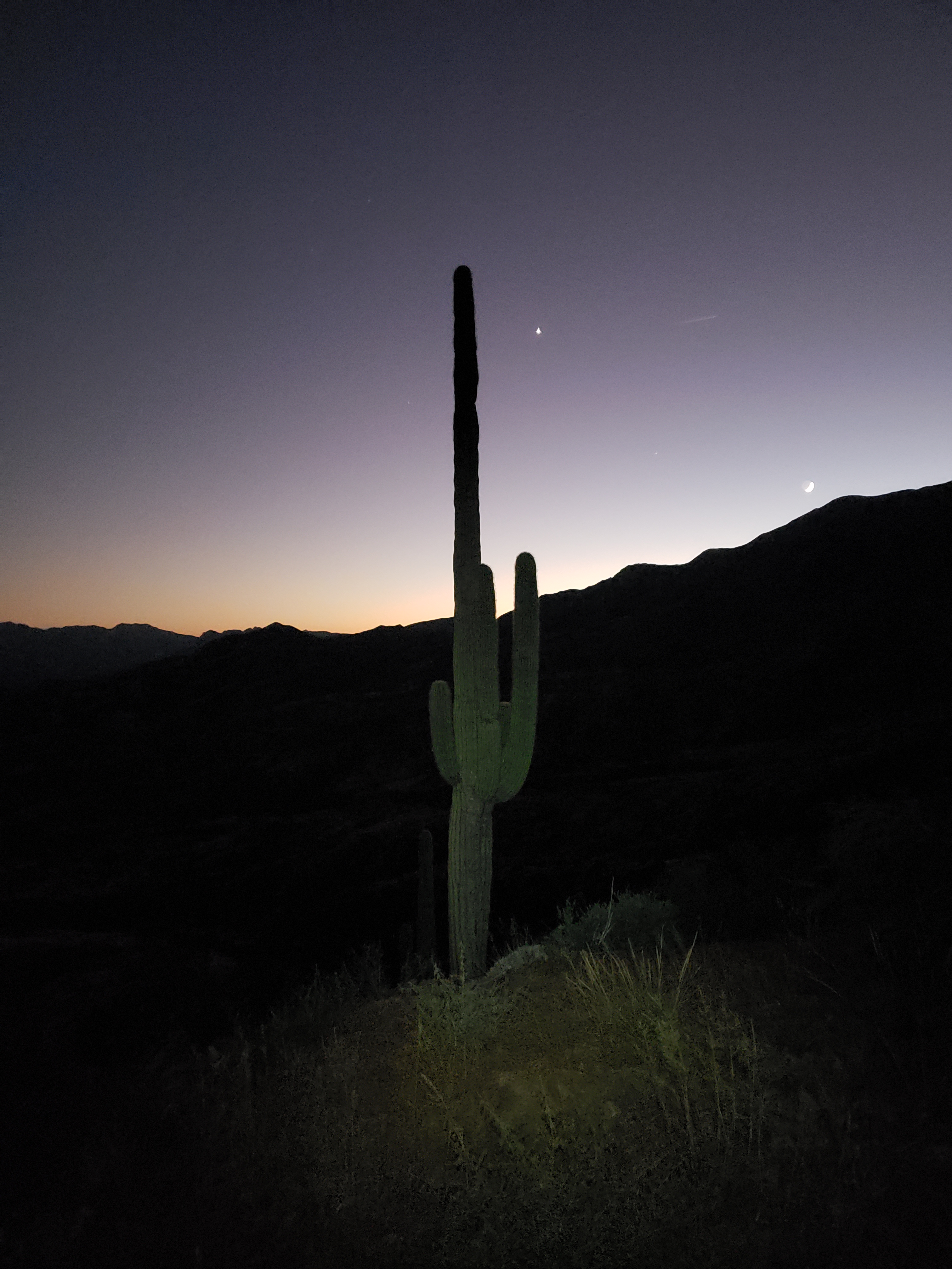 We descend down into the dark heat of the saguaros, whose silhouettes we can make out against the stars. In the dark the sonoran desert comes alive- rustlings in every bush, glowing eyes, birds everywhere. Matthew’s in front when we come upon another rattlesnake- it rattles ferociously, we walk around it and continue on our way. Normal rattlesnake behavior. I still feel bad that Matthew- I mean Shade’s- first ecounter with one was so scary and atypical.