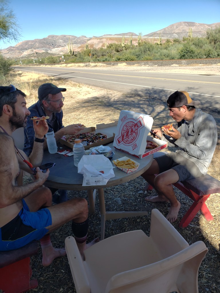 It’s so hot. I mean I know in the last section I was being a weenie about even mild heat, and then yesterday I felt like I’d finally adjusted! But today it’s actually hot. Alan’s watch says 94 degrees. We’re contouring above the Gila river on nicely graded, beautifully groomed trail, as trail seems to go in this section, and we are roasting in the sun. No shade and lots of gentle climbs that feel brutal in this heat. This morning was awesome! We woke up next to the Gila river, where we’d staked our shelters in the dust full of spiders (that live in the dust? We’re not sure) and in the cool of the morning we were cruising- in 16 miles we knew there was a trailhead where you can order pizza from the town of Kearney, and we were on track to make it there by 1:30. And while hiking I crossed paths with two nice hikers, Queen B and Slow Miles, who recognized me from this blog and were so nice. I was feeling great! But now it’s noon and I’m melting. Things went from comically sweaty and doable to oops I got a bit too warm and now everything feels slurry pretty quick. I’ve got a warm half liter of water with nuun in it to make it the last 3.5 miles to the trailhead where there’s supposed to be a spigot.