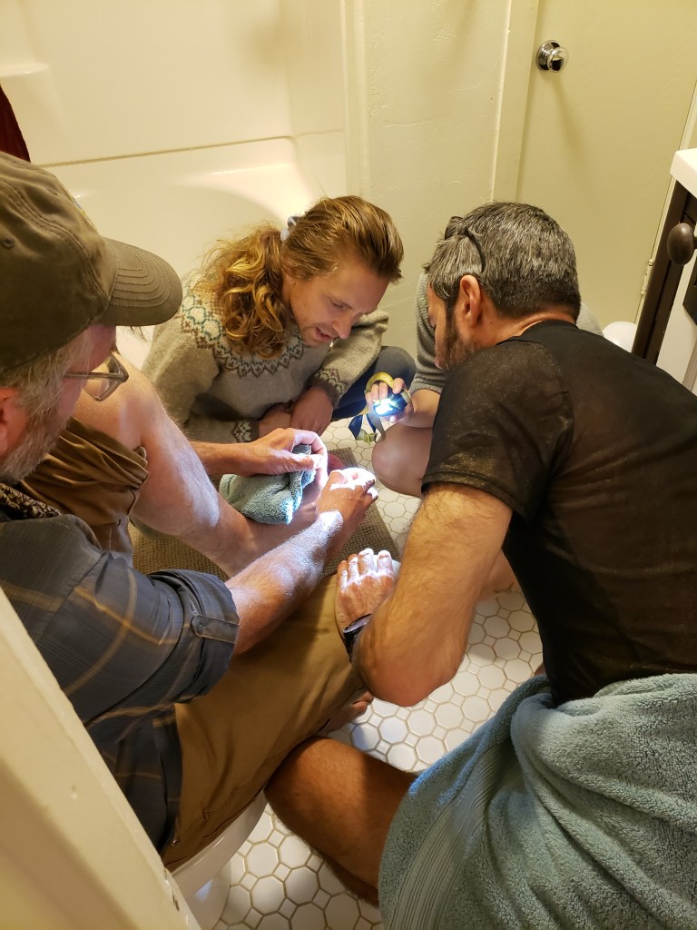 A local trail angel, DD, and her perfect chihuahua Manny meet us at the trailhead and ferry us to the post office, where we’ve made it in time to get our boxes. Then my hiker friend Pilar is here! With her sibling, Ansel. The two of them are on a southwest roadtrip. Pilar is one of the people I hiked the L2H with in 2019, and it’s so good to see her again! They bring us bagged salad, which is a dream. We find a cabin nearby that can sleep all five of us, and soon we’re eating huge burgers at the local burger place, where the onion rings are gluten free somehow? and I slip a bunch of mayo packets into my pockets. Sirius, my friend in Tucson who was also on that L2H hike, drives out to the cabin and we all hang until well past hiker midnight, talking about the shapes of our lives and arguing over what to do about Shade’s blisters, which have really gone off the rockers in this heat. Blisters are something that every long distance hiker has very strong opinions about, and it’s fun to blather about our competing theories, crouched around poor helpless Shade in the bathroom, our headlamps illuminating his toes. At 10:30 none of us can keep our eyes open any longer, and we turn down the blasting heat and tuck in.