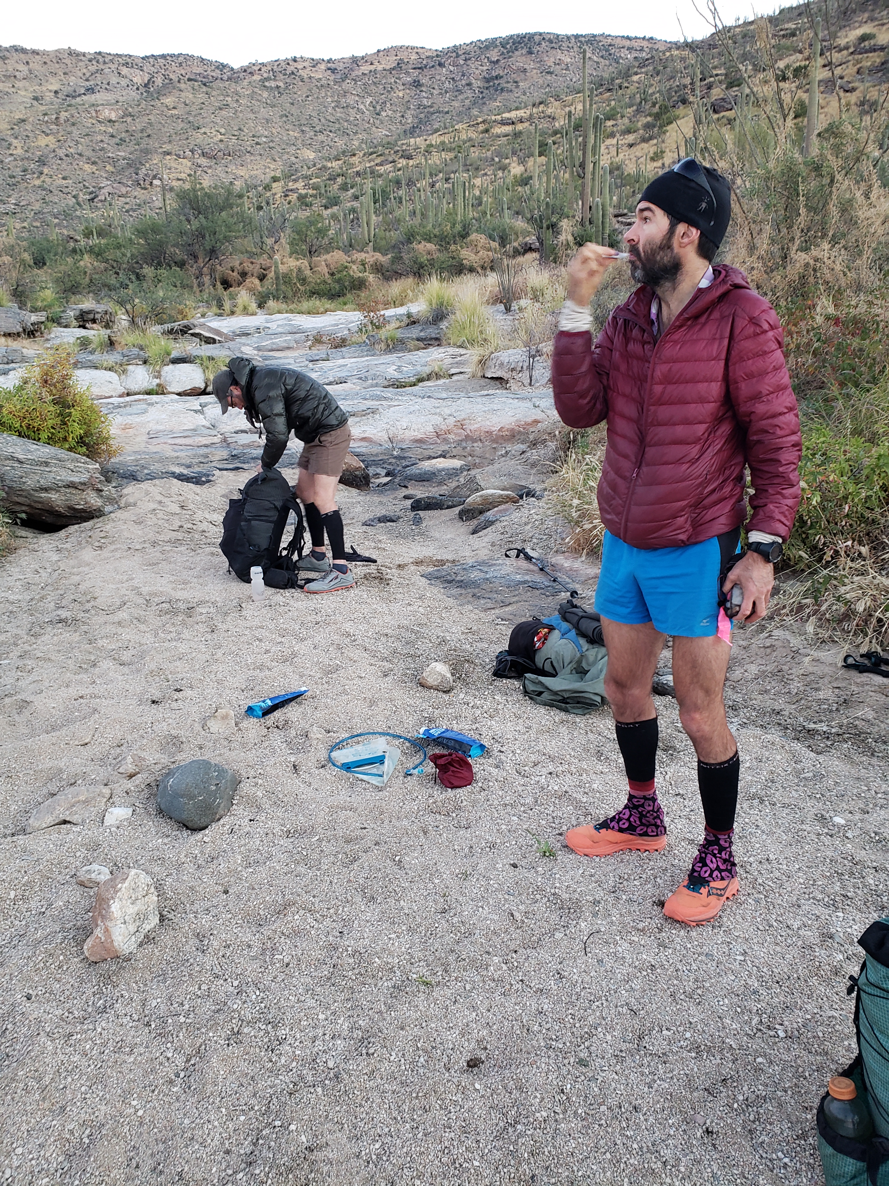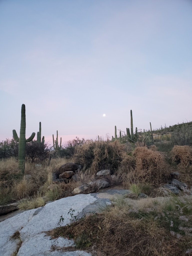 The sun heaves itself up into the known world, revealing the saguaros. The heat comes on but it’s a gentle heat- the toothless heat of late November in the sonoran desert. We walk, and the trail is flat, and mostly free of rocks, and I set my feet to “flat ground” and cruise. Finally some easy miles. The kind of miles that almost feel like resting. The “free space” in a bingo card. Even though I’m tired, these gentle miles do wonders for my morale. I decided after waking this morning that I would go into Tucson for the night when we reached Vail, to rest and charge my literal and metaphorical battery pack, and return in the morning. That I would let my friends go ahead, to get to Patagonia in time for Shade’s flight. I would hike those miles from Vail to Patagonia alone. I didn’t feel like I could keep up. I felt busted, like if I didnt get at least a half day of rest something would break. But now, a few hours into the day, I’m feeling better- maybe I can do this. I call Rusty, my Tucson friend who was gonna pick me up. Yes, they say, they can buy me another battery pack and bring it to the trailhead. An incredibly generous favor!! Then I won’t need to spend the night in town.