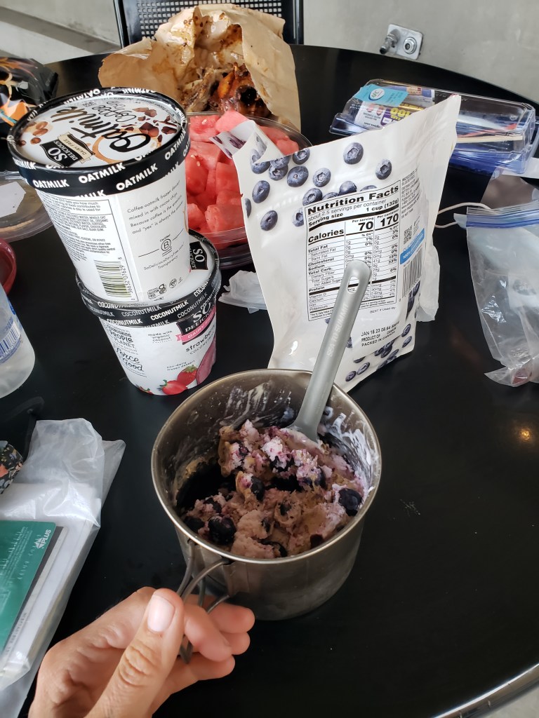 Rusty meets us at the trailhead in their cute old volkswagon truck and ferries us all to the safeway down the road to resupply- a safeway we’ve been talking about for weeks now. I’ve been fantasizing about eating dairy free ice cream with frozen blueberries, roast chicken and watermelon, and washing it down with an entire carton of almond milk. I make this a reality, spreading my loot across one of the tables outside.
